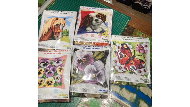 3 slags påtegnede i finere tælling med små trærammer, og 40x40 cm puder i flotte motiver