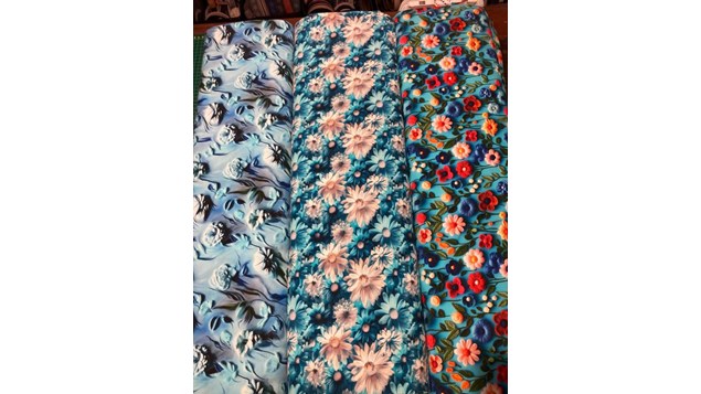 Sommerstof, nyheder kom ind ad døren i går: Superflotte jerseyprints m/blomster, ligeså flotte Jersey i børneprints, fast viscose m/blomster, en enkelt voile, og et par hør/viscose.