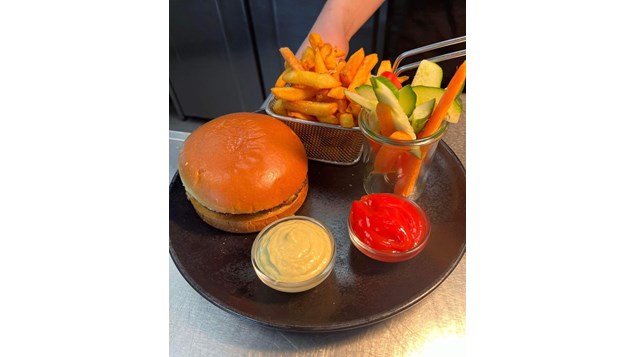 Vi har også en menu, som passer til en børnemave, det kunne f.eks. være børnebrunch, nuggets, friteret torsk eller som her en cheeseburger