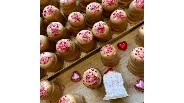 Den er lavet på en marcipan bund med en frisk og lækker hindbærskum, dyppet i dulcey chokolade 🩷