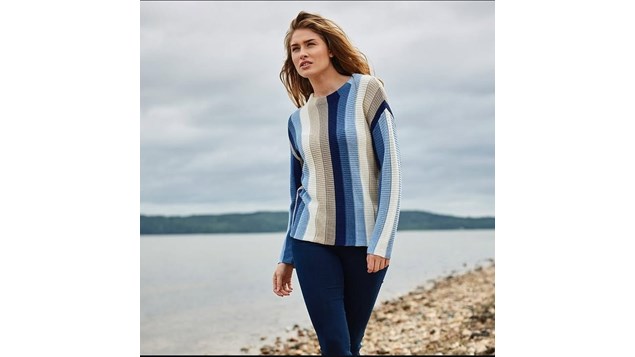 Denne smukke stribede sweater er både stilfuld og komfortabel. Lavet af 55% acryl og 45% bomuld, er den blød, let og perfekt til alle årstider. Med sin klassiske kombination af blå, beige og hvide nuancer passer den perfekt til både jeans og mere formelle outfits.