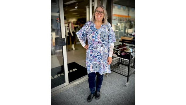 Den kan styles med bukser som Vibeke her viser eller fx. med et par leggings. Det er næsten kun fantasien der sætter grænser 🩷