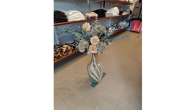 Vi er så glade for at have hjulpet en sød kunde, som selv medbragte denne flotte vase – og sammen fandt vi den perfekte kunstige buket blomster til at fuldende udtrykket