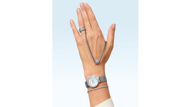 BERINGs Classic sæt i poleret sølv garanterer et blændende look. Fremstillet af allergivenligt rustfrit stål og perfekt komplementeret af en meshlænke og en skinnende perlemor urskive.
