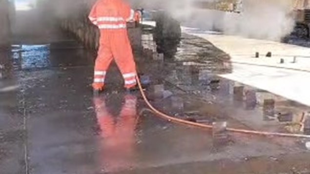 Selvom det er Kristi himmelfartsdag, knokler vi for at få renset maling og rust af på et skib som ligger på bedding