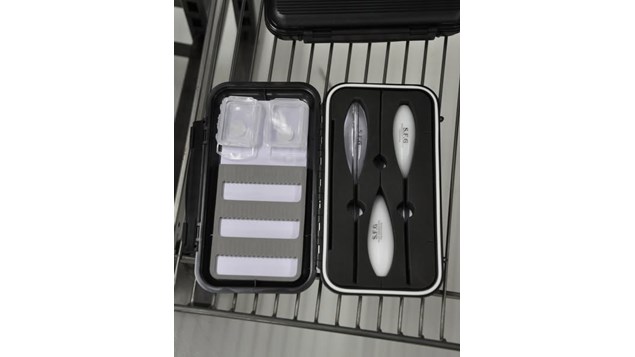 Denne kasse fra S.F.G får du 3. bombardaflåd i 3 forskellige modeller. en synkende, en intermediate og en flydende. I kassen har du plads til fluer, og du har små plastik kasser i til svirvler, hægter mm.
