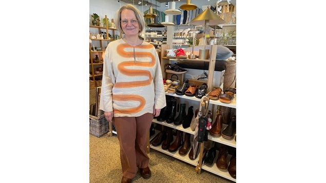 Ulla i super smart skjorte fra Rabens Saloner Butikken er simpelthen fyldt med de skønneste farver.